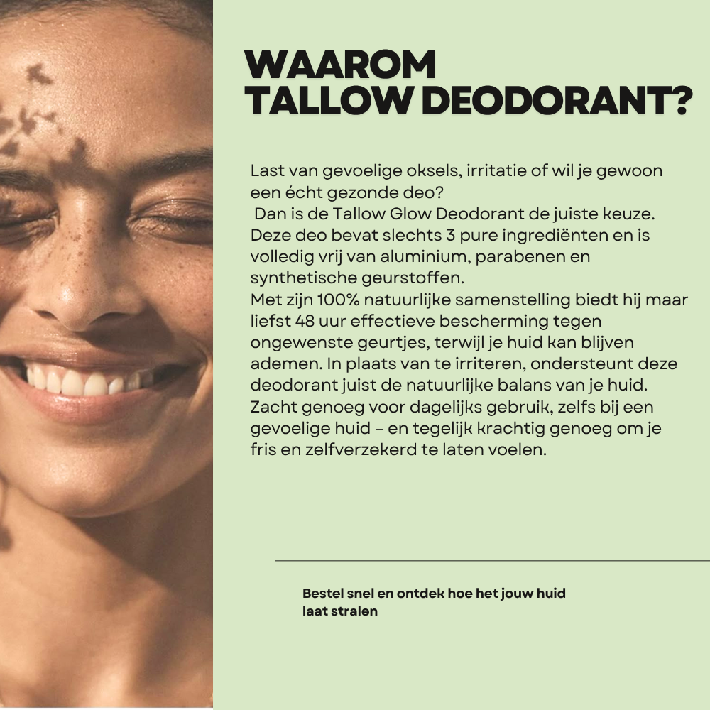 Bij Tallow Glow geloven we in huidverzorging die écht werkt. Onze producten zijn gemaakt van 100% natuurlijke ingrediënten, zonder rommel, en boordevol voedingsstoffen die je huid laten stralen.